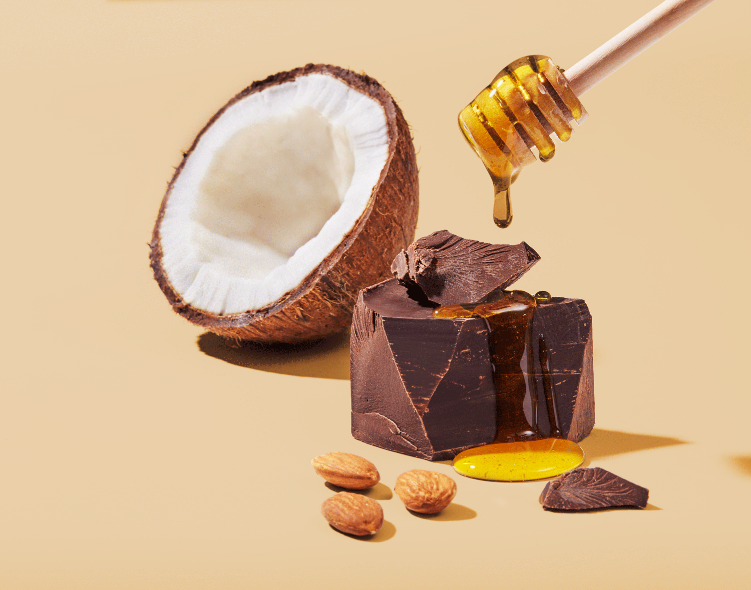 A product photo of a half coconut, large chunk of dark chocolate and almonds with honey dripping from a honey wand.