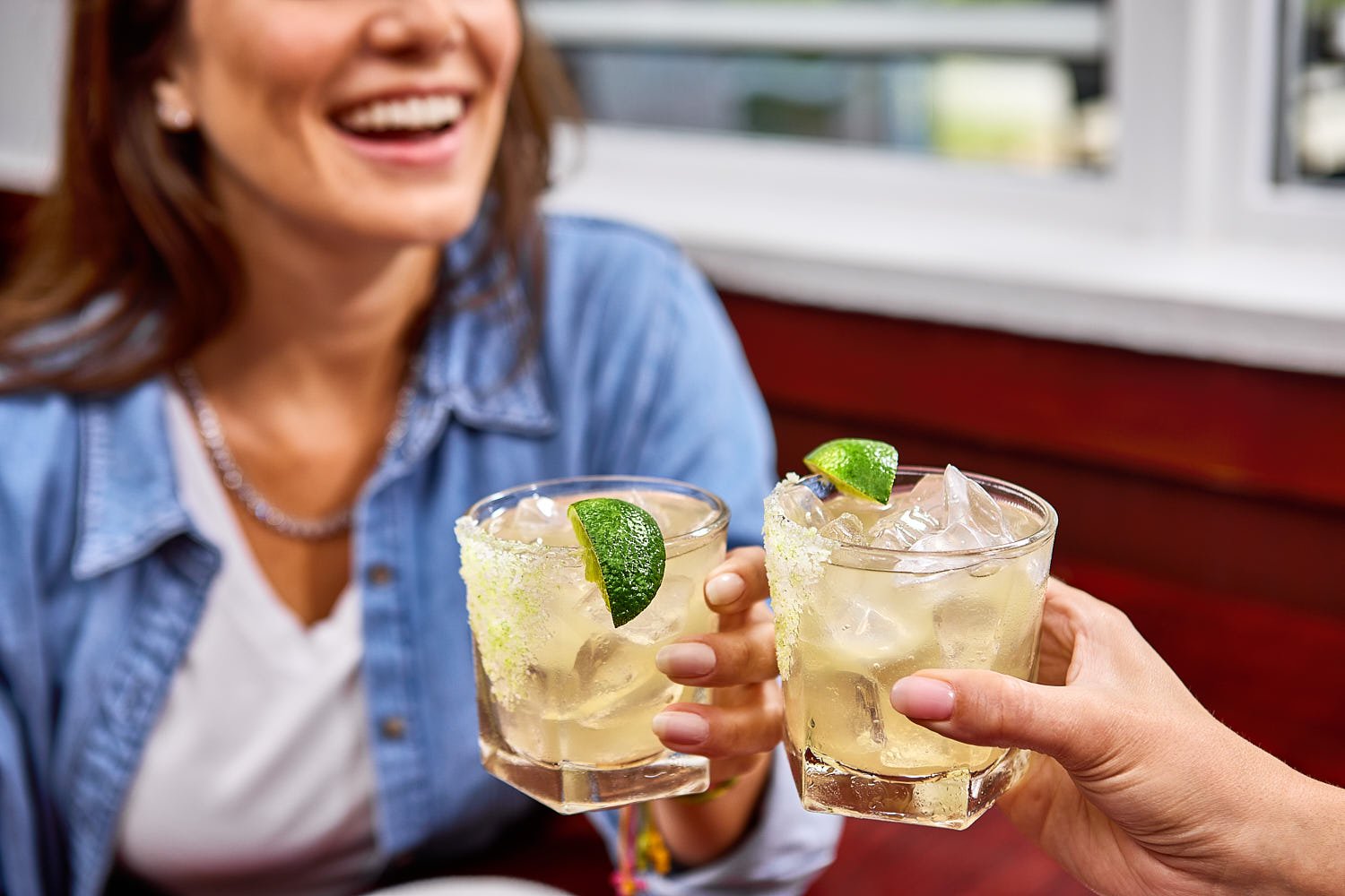 Two women toasting Margarita’s in a restaurant. Shot is close on cocktails showing one woman in a blue shirt.
