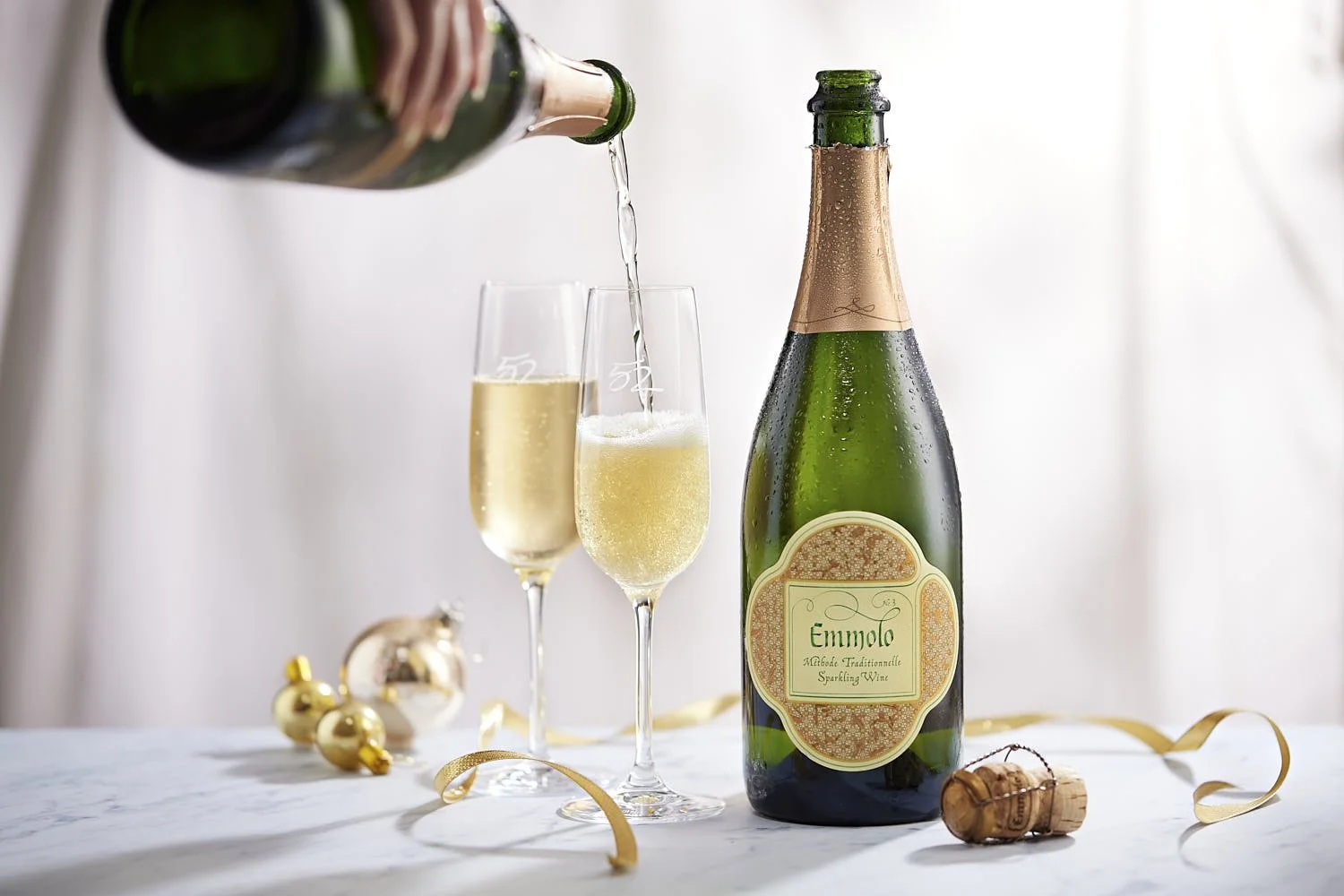 A hand pouring a bottle of Emmolo sparkling wine into a champagne flute. There are two glasses and a bottle of Emmolo along with holiday decorations.